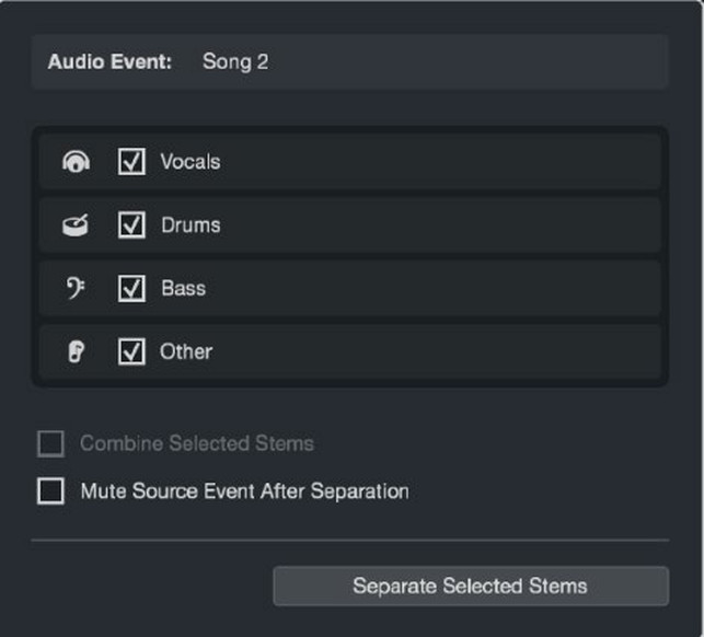 最大4要素(ボーカル、ドラム、ベース、その他)に分離させることが可能で、分離したオーディオはそれぞれ独立したオーディオトラックとしてCubase上で作成されるため、エフェクト挿入やミュート、ピッチ補正などが手軽に行えます。