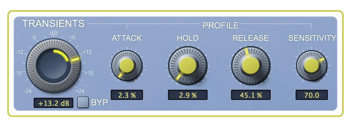 ドラムのアタックを精密にコントロール。キックにパンチを、スネアにスナップを加える、または耳障りなトランジェントを和らげるなど、周波数依存の設定で理想的なダイナミクスを実現。アタック、ホールド、リリースといった直感的なパラメーターで、ミックスに明瞭さとインパクトを与えます。 -