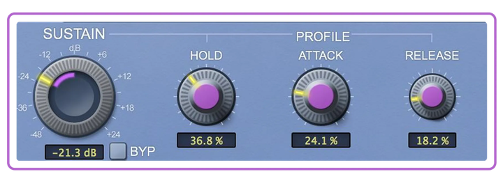 サステインをブーストしてレコーディング素材のアンビエンス成分を際立たせたり、逆にカットすることで精確なゲート処理が可能になります。