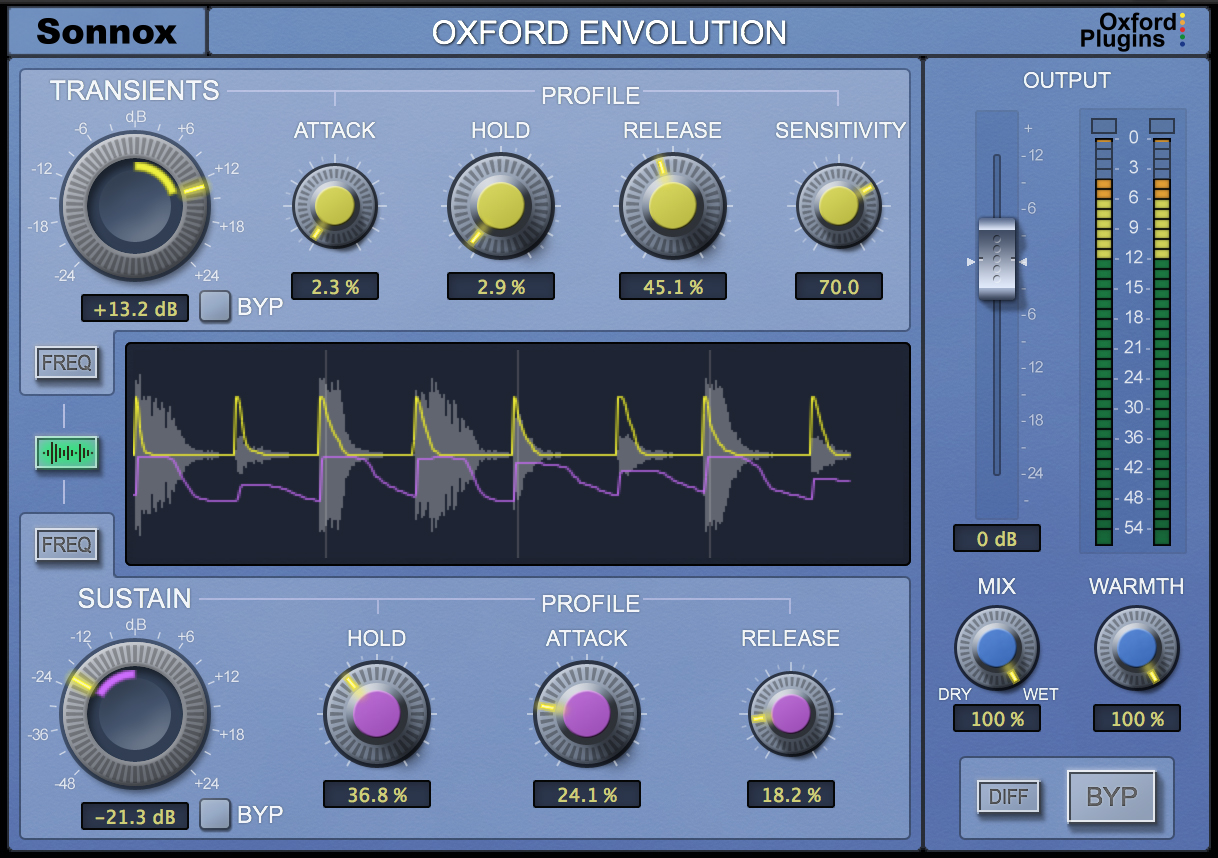 トランジェントおよびサステイン成分を個別に処理することで、楽器を始めとしたオーディオ素材のエンベロープを徹底的に再成形することが可能です。