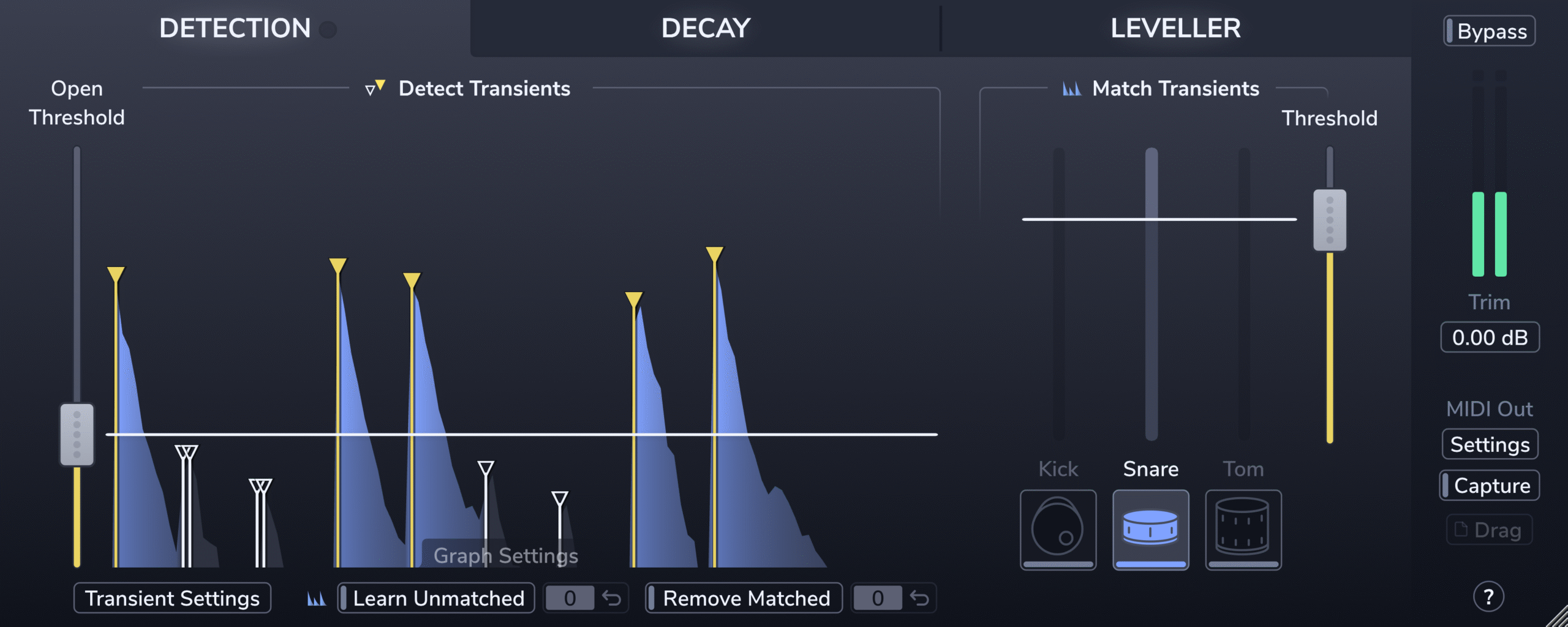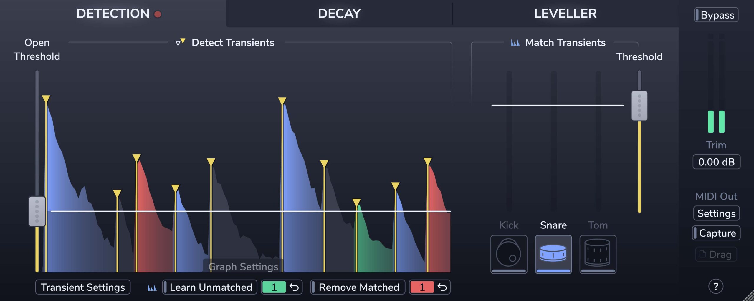 独自に開発したトランジェント検出を行い、その後、検出された中からどのドラムヒットを残したいかの取捨選択を行います。