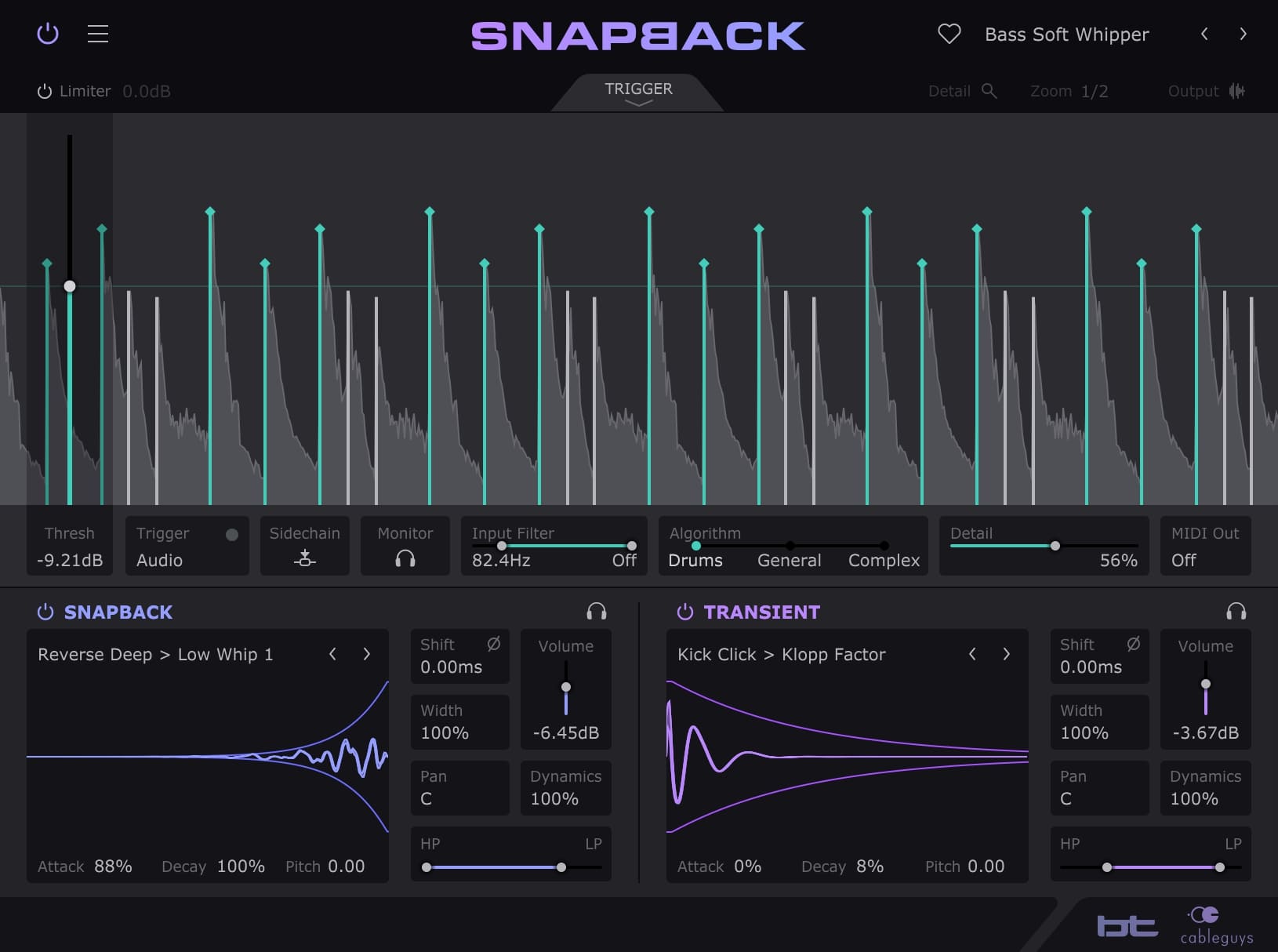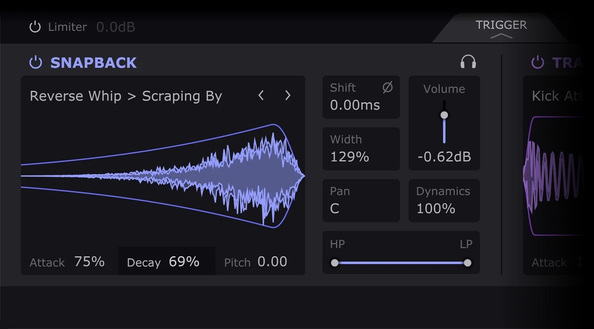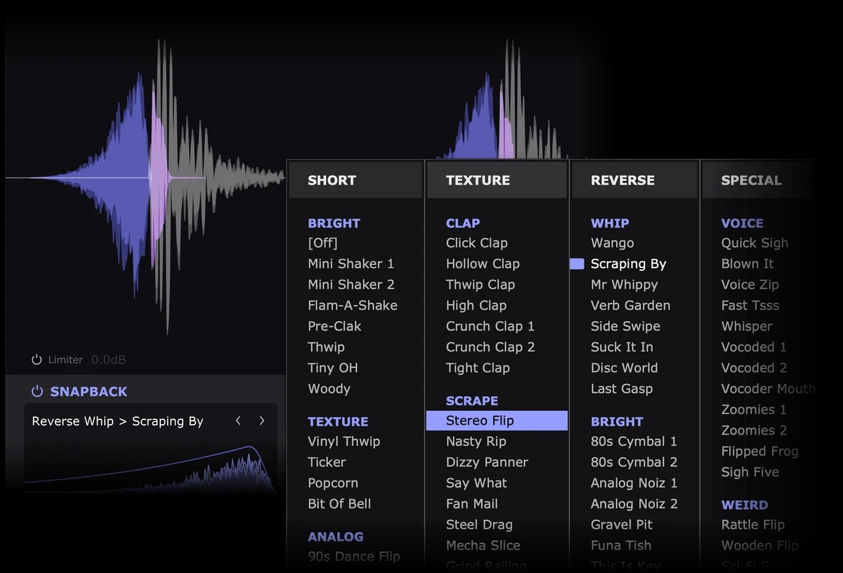 - プリ・トランジェント・レイヤリング: トランジェント(音の立ち上がり)の前にスナップバック・サンプルを重ねることが可能です。プロデューサーが生きたグルーヴを作るためのテクニックです。