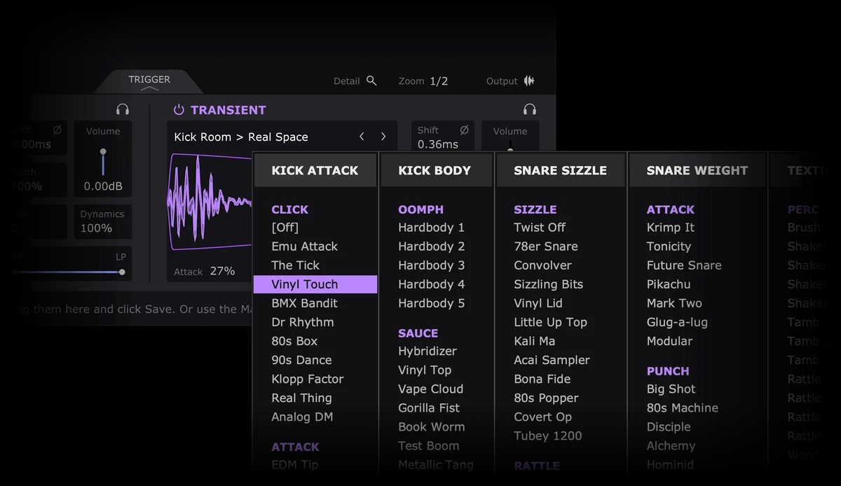 音の立ち上がり部分にシフトされたクラップをワンクリックで追加したり、キックやスネアに独自の質感を加えたりすることが可能です。