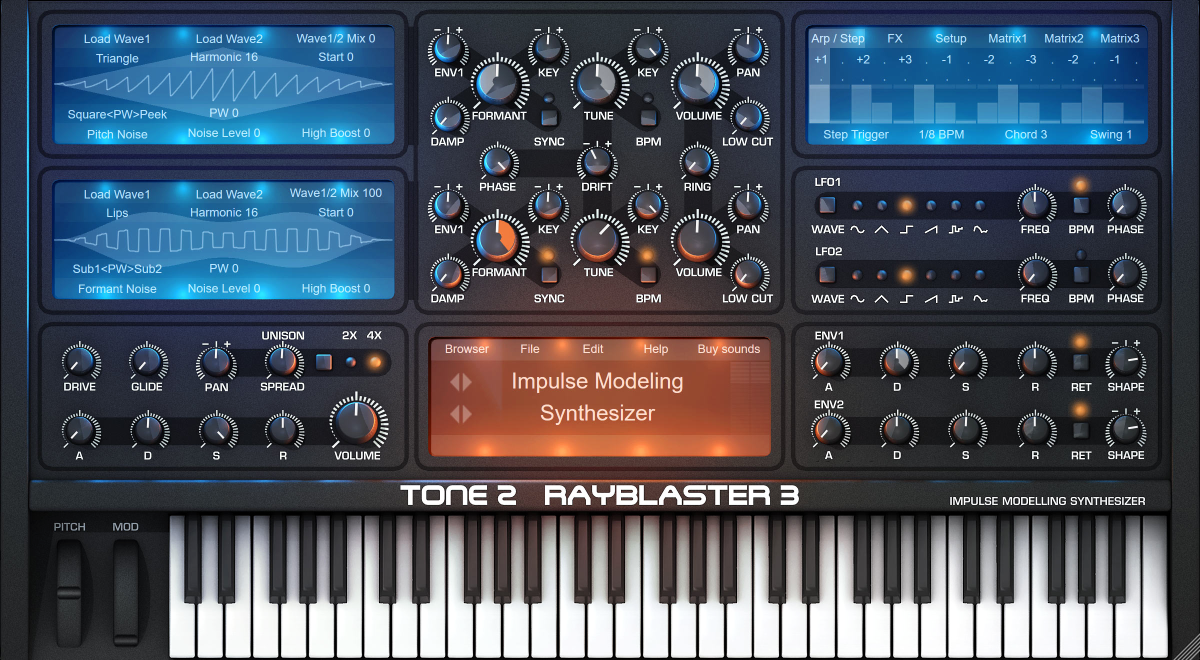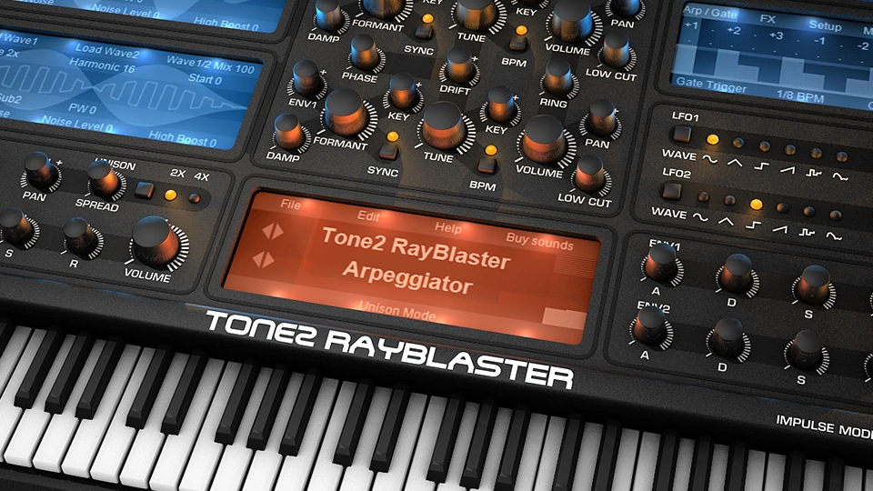 RayBlasterのオシレーターには、フィルター特性だけでなく、他のシンセサイザーの波形もインポートできます。これにより、無限の数の波形を作成でき、それらはすべてリアルタイムでモーフィング可能です。ドラムループやボーカルフレーズなどの短いサンプルを再合成することも可能です。RayBlasterは、複雑なサウンドをトラックのBPMに同期させるだけでなく、すべてのサウンドのピッチ、タイミング、音色をリアルタイムで操作する機能も備えています。