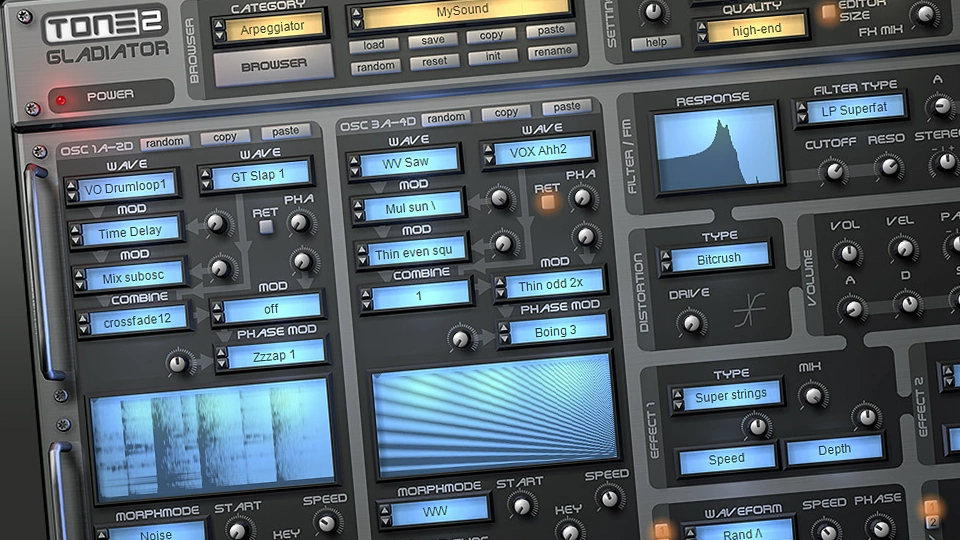 Gladiatorは、受賞歴のあるTone2独自のハーモニックコンテンツモーフィングHCM合成を搭載し、自然楽器、声、そして合成音のスペクトルがどのように動的に変化するかを分析し開発されています。それぞれの音について、256個の時間的スペクトルスナップショットが作成されており、時間の経過とともに、これらのスナップショットは動的に変化し、モーフィング、ループ、その他様々な方法で操作する事が可能です。さらに、10個のモジュールと132種類のアルゴリズムを用いて倍音成分を変化させたり、強力なランダム化機能により、マウスを 1 回クリックするだけで、これまでにないサウンドを無制限に作成できます。これらを総合することで、事実上無限の数の異なるサウンドを生み出すことができます。