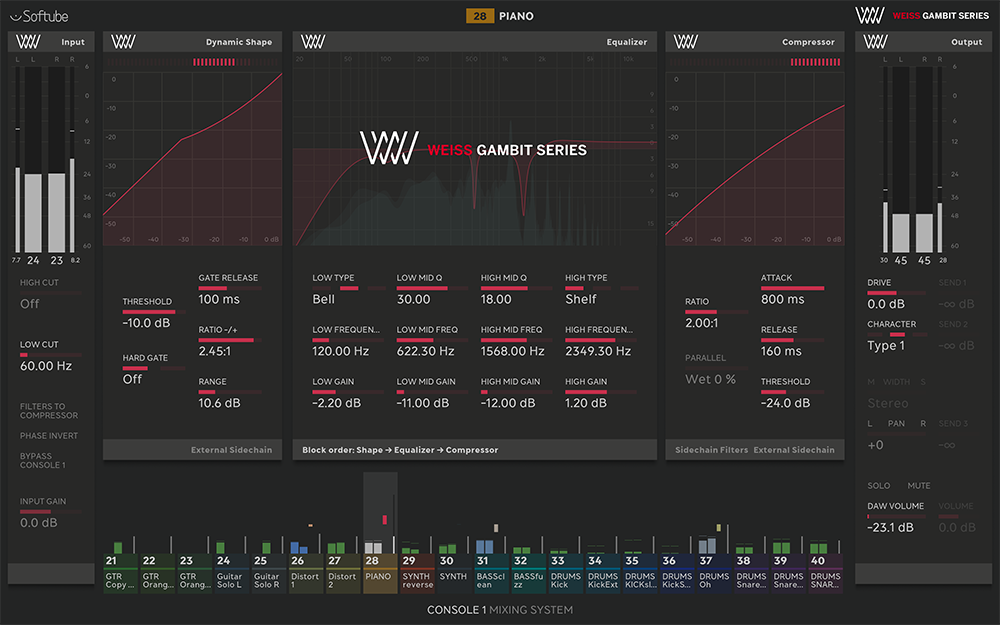 Weiss Gambit Series for Console 1は、Softubeのハイブリッド・ミキシング・エコシステムConsole 1専用のアドオンであり、 Weiss DS1-MK3とWeiss EQ1の中核をなすプロセッシング要素が1つのチャンネル・ストリップに統合されています。