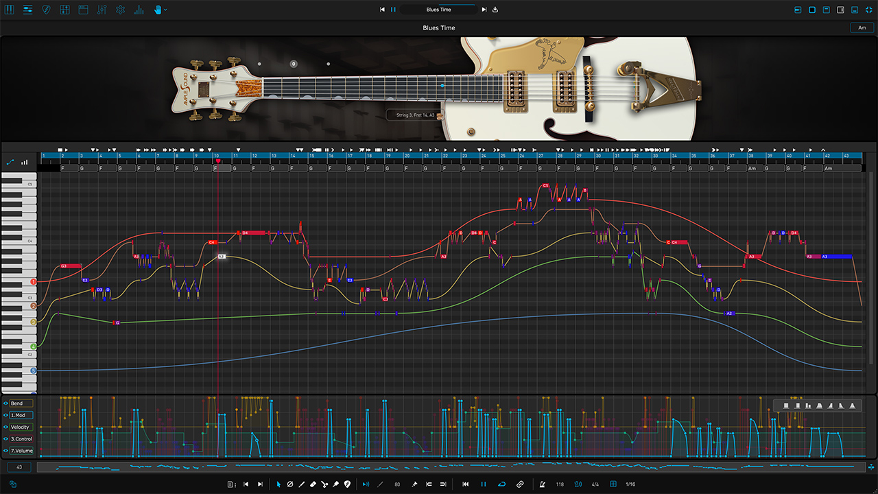 ギター・リフを作成する「Riffer 4」機能では、ピアノロール上で演奏される弦ごとに、どのノートがどの弦で演奏されるのかイメージしながらリフをエディットすることができます。また、DAW さながらのMIDI CCやベロシティ・エディターも完備。コードやキーを指定して、合わせてノートをまとめて転調することも可能です。ストラム作成がより直感的かつ効率的になる「Strum Note」機能によって、リフ中の和音を構成する複数のノートを1つのオブジェクトとして扱うことができ、ストラムのタイミング、ベロシティの変化、レガートといったパラメーターを一括コントロールできます。