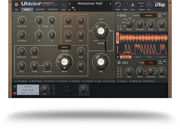 良質なリバーブは決して主張しすぎません。しかし、それが無いとトラック全体から深みが失われるのを感じるものです。Uhbik Ambienceは、アーリーリフレクション(初期反射)とプレートリバーブを組み合わせ、それぞれを自在にコントロールできるリバーブ・プラグインです。繊細な空気感から、広大な宇宙空間のような響きまで、思いのままに描き出します。