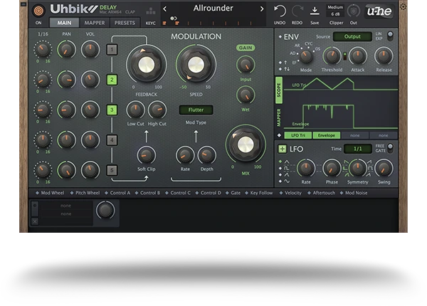 物理的なテープの制約に縛られないUhbik Delayは、各タップの位置を自由に設定できることで、超短ディレイ、複雑なリズムパターン、没入感のあるサラウンドエフェクトまで幅広く表現できます。