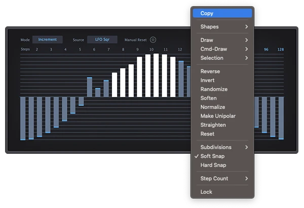 −100.00 〜 +100.00の範囲で最大128ステップの値を保持できる、テーブル型モジュレーション・ソースです。任意のパラメーターに対して、複雑で時間的な変化を正確にデザインできます。