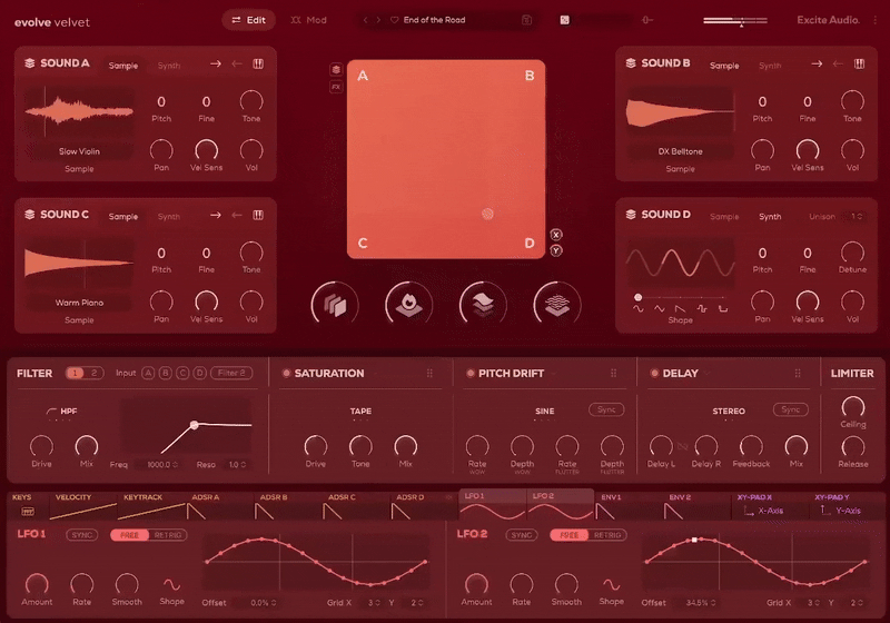 4つのレイヤーからサウンドをブレンドし、XYパッドでそれらを滑らかに変化させ、ベルベットの質感をイメージした4つのマクロ・エフェクトを使って音を作ることができます。
