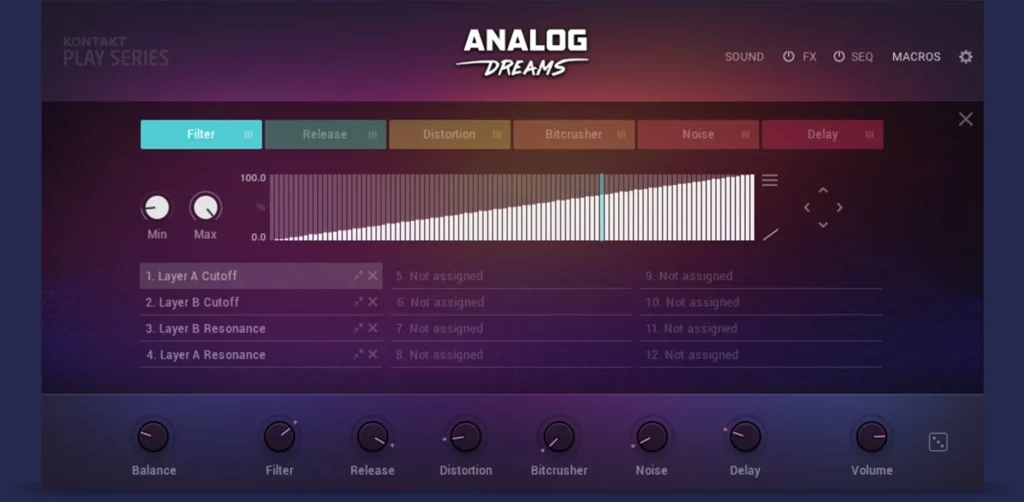 最大6つのマクロにフィルターやディストーションをアサインし、モジュレーションをかけることができます。 -