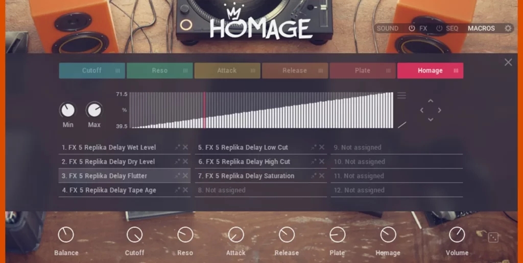 最大6つのマクロにフィルターやディストーションをアサインし、モジュレーションをかけることができます。 -