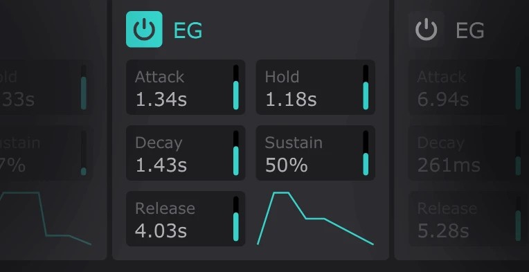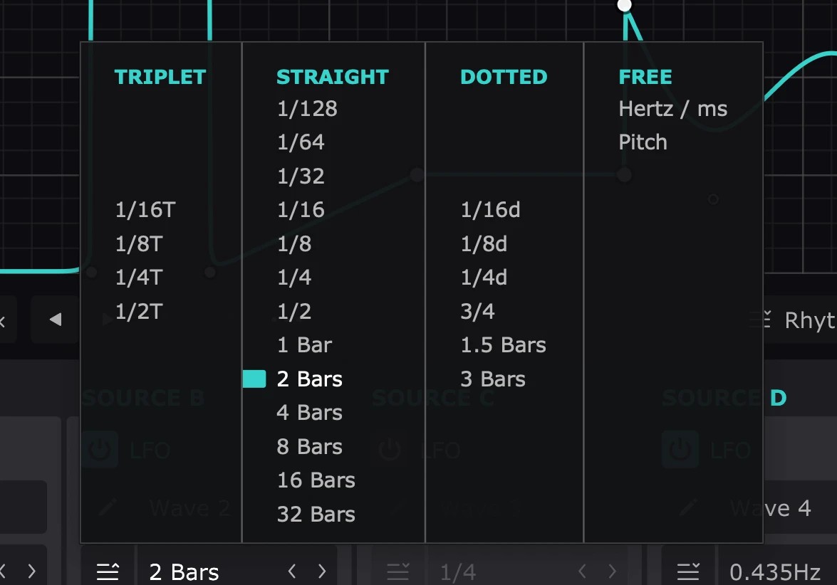 本作のLFOはDAWのタイムラインに自動同期し、32小節から128分音符までの長さで設定可能です。またアナログスタイルのフリー・ランニング・モードでは、0.02Hzから最大5.24kHzまでの範囲で動作させることができます。