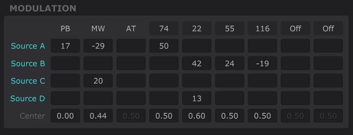 4つのモジュレーション・ソースをピッチベンド、モジュレーション・ホイール、チャンネル・アフタータッチ、および最大6つの任意のMIDI CCにルーティングできるモジュレーション・マトリックスにより、パッチ作成が容易に行えます。