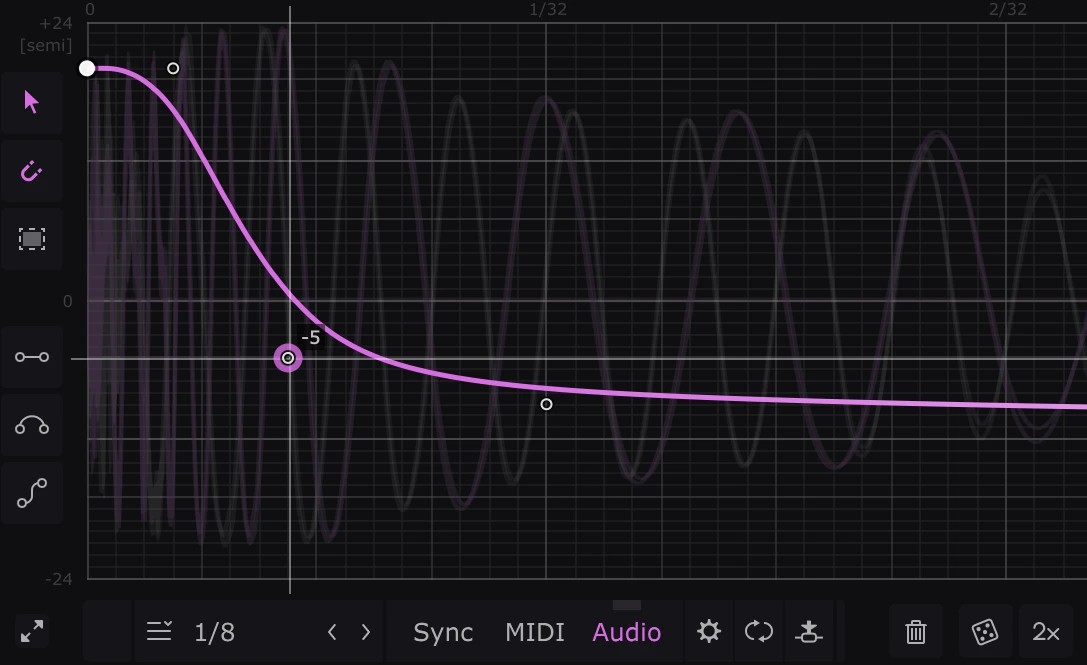 直感的なピッチカーブを描画して、サンプルやシンセ、楽器に新しいメロディの命を吹き込みます。オクターブ・ジャンプ、アルペジオ、ベンディング、ピッチ・ドロップを描き込むことも、1クリック・パターンで即座にアイデアを得ることも可能です。