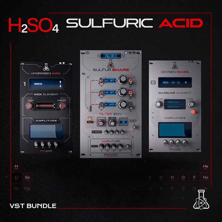 本製品『Sulfuric Acid』は、Oxygen Bass / Hydrogen Kick / Sulfur Snareのバンドル製品です。