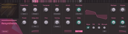 このリシンセシスエンジンが真価を発揮するのは、ドラム・ループのような非音階的な素材を入力した時です。そこから、豊かでインスピレーションを刺激するハーモニクスを生成します。