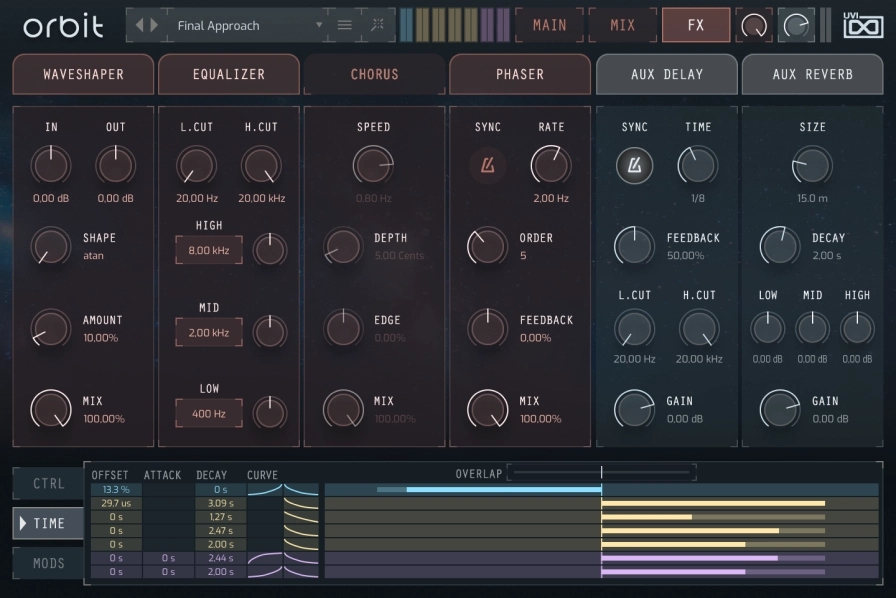 トレモロ、ディストーション、ラウドネス、テープキャラクター、空間系エフェクトなどを加え、さらに「Orbitモード」を使用すれば、演奏、オートメーション、動きの形成をひとつのクリエイティブなジェスチャーとして統合できます。
