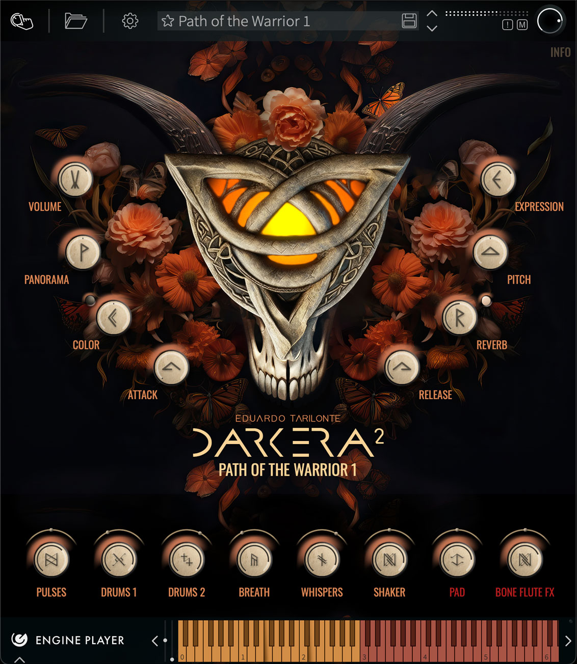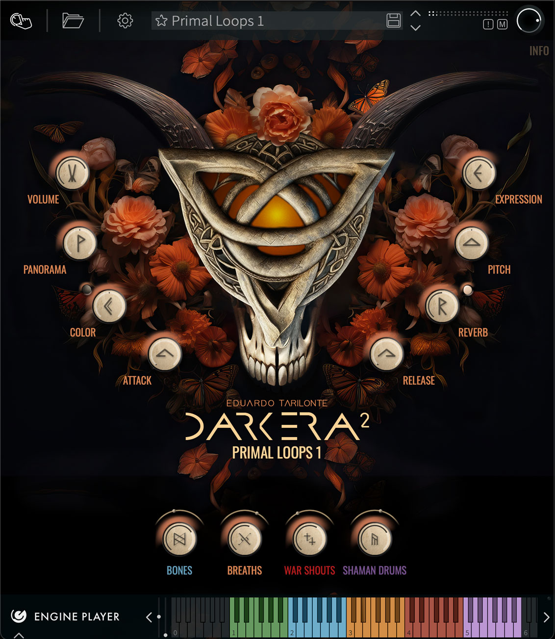 『DARK ERA 2』には、前作『DARK ERA』の全コンテンツを含む、歴史的に貴重な民族楽器の数々が収録されています。TagelharpaやCrwthといった弦楽器から、Bone Flutes、Overtone flutes、Fujara、Wooden Lur、War Hornらプリミティブで郷愁を誘う管楽器に、骨や石の荒々しい音色からShamanic DrumやSkin Drumをはじめとする強烈な打楽器群。そして呼吸をグルーヴに変えるブレスリズムや深いドローンボイス、有機的なマウスパーカッション、戦いの叫び、シャーマニックな祈願、深淵を思わせるホーメイなどの喉歌や力強い掛け声など、楽曲の物語性を高める儀式的 / 民族的なボーカル・マテリアルがより人間味と幽玄さを増しています。各楽器には、実器の奏法に基づいた複数のアーティキュレーションが用意されており、緻密にサンプリングされた太古の響きを自由に操ることができます。特に管楽器は、滑らかなレガートを基本に各種奏法を用意。打ち込みでは再現が難しい装飾フレーズや脳裏に焼き付いて離れないような効果音的奏法などは、実際に演奏されたオーディオサンプルを収録しているため、楽曲の"らしさ"を引き立たせることが出来ます。また、弦楽器や打楽器などを中心に、MIDI フレーズがマッピングされているものがあり、指先一つで物語を突き動かす力強いグルーヴを構築可能です。