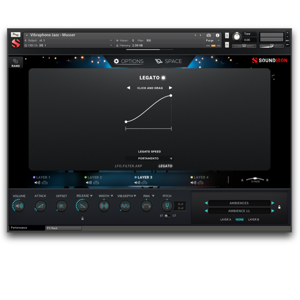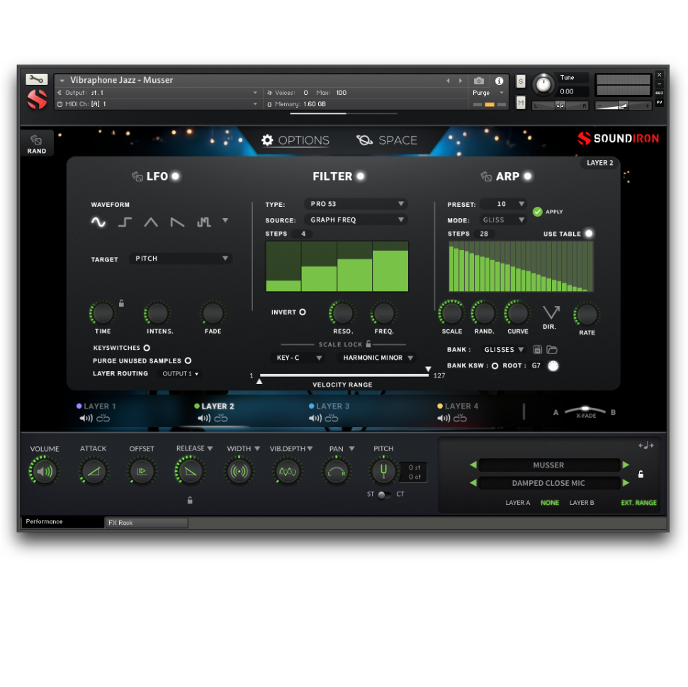 Kontaktインターフェースには、オートメーション対応のコントロール一式を搭載。スウェル、アタック、リリース、オフセット、ビブラート、フィルター、ピッチ、アーティキュレーション切替、クロスフェード、レイヤリングなどを制御できます。さらに、波形やターゲットを選択可能なLFOシステムや、ベロシティなどを割り当て可能な12種類のフィルターも備えています。