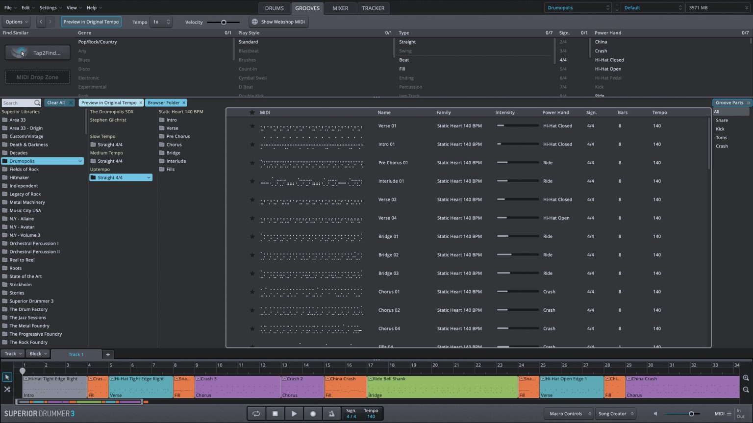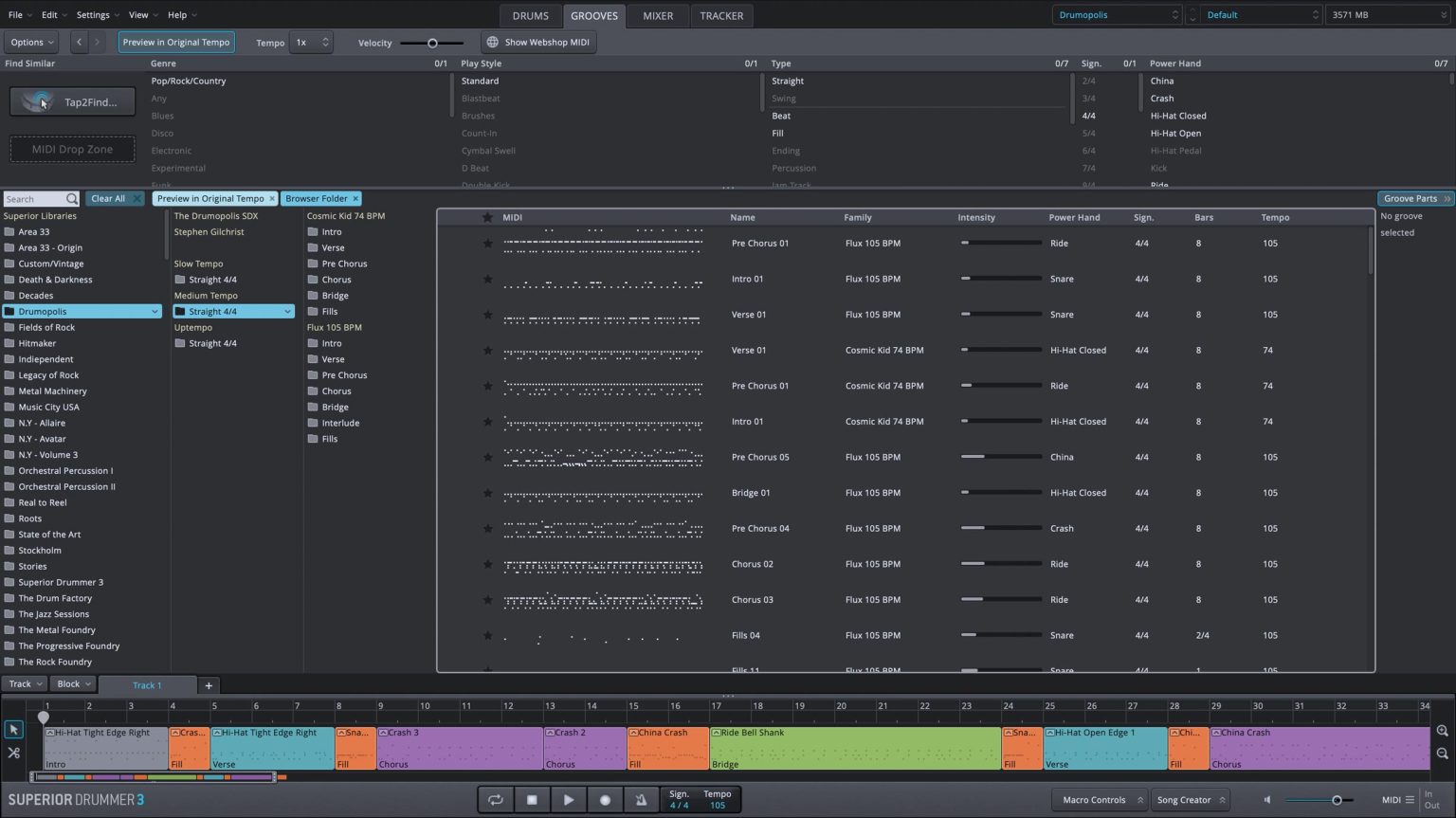 「SDX」には、それぞれのドラム・サウンドに完璧にマッチし、かつ使いやすく分類された、数百にも及ぶMIDI グルーヴ・ファイルが用意されています。つまり「SDX」を『Superior Drummer 3』エンジンに追加する事で、お好きなドラム・サウンドとプロドラマーのグルーヴが手に入るのです。