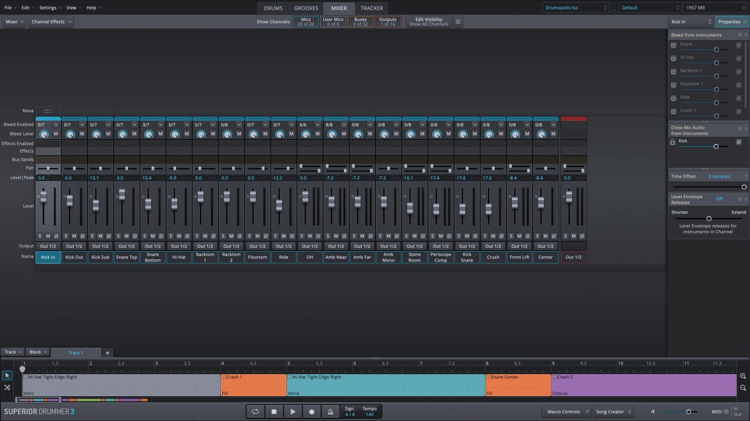 - 11個のキック、13個のスネア、34個のタム、22枚のシンバル、4セットのハイハットを含む、合計8つのフルドラムキット