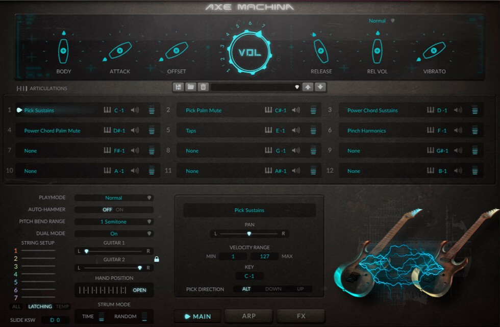 7弦ギターのオープン / ミュートノート、パワーコード、ハーモニクス、ピックスクラッチ、フレットノイズなどを詳細にサンプルし、カスタム FX、オートストラム機能までも搭載しています。