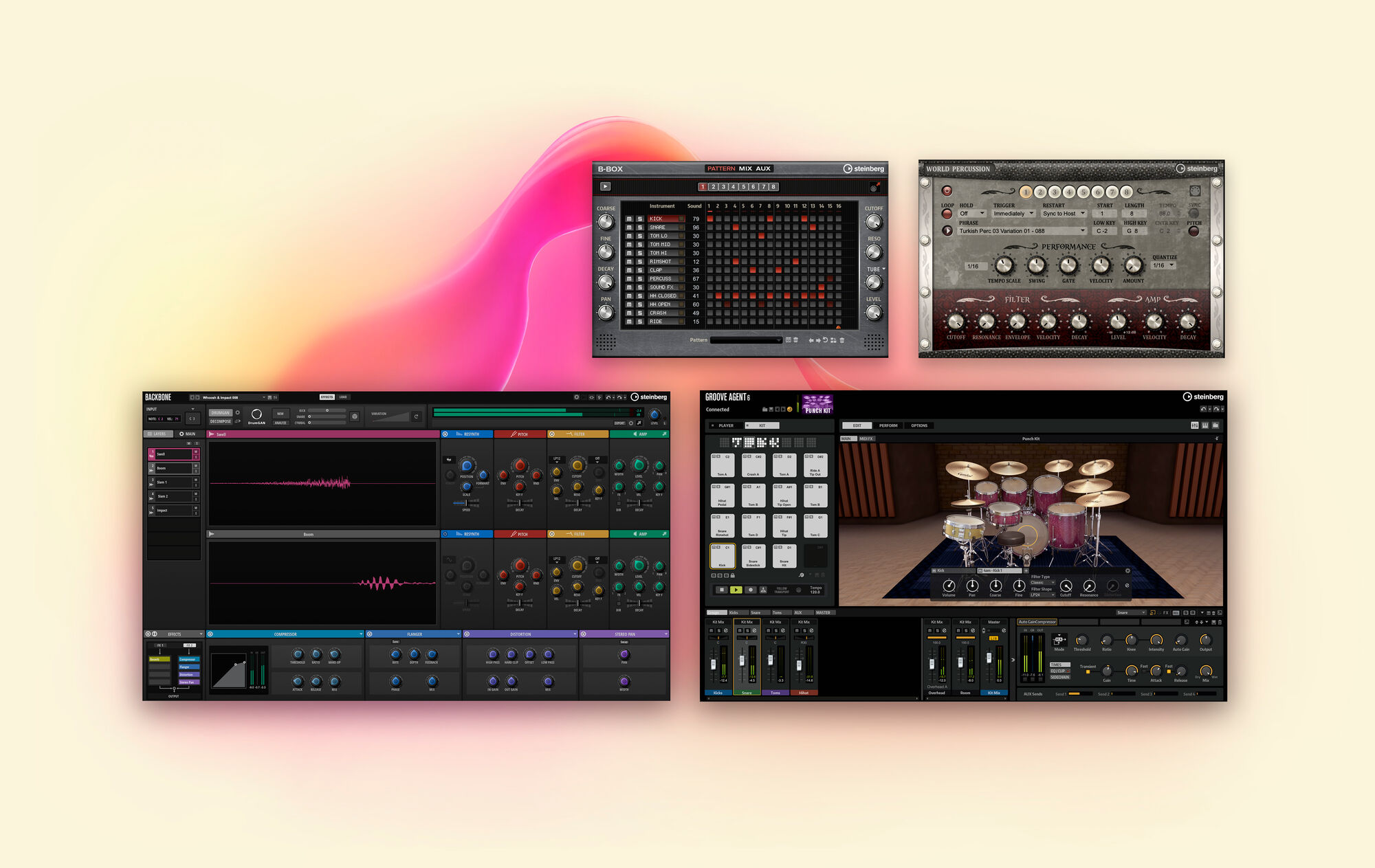 直感的なビートメイキングからリアルなアコースティックドラム、パーカッションまでカバーする「Groove Agente」、AIパワーのドラムサウンドデザイナー「Backbone」、そして「B-Box」や「World Percussion」などのサンプルライブラリーまで。