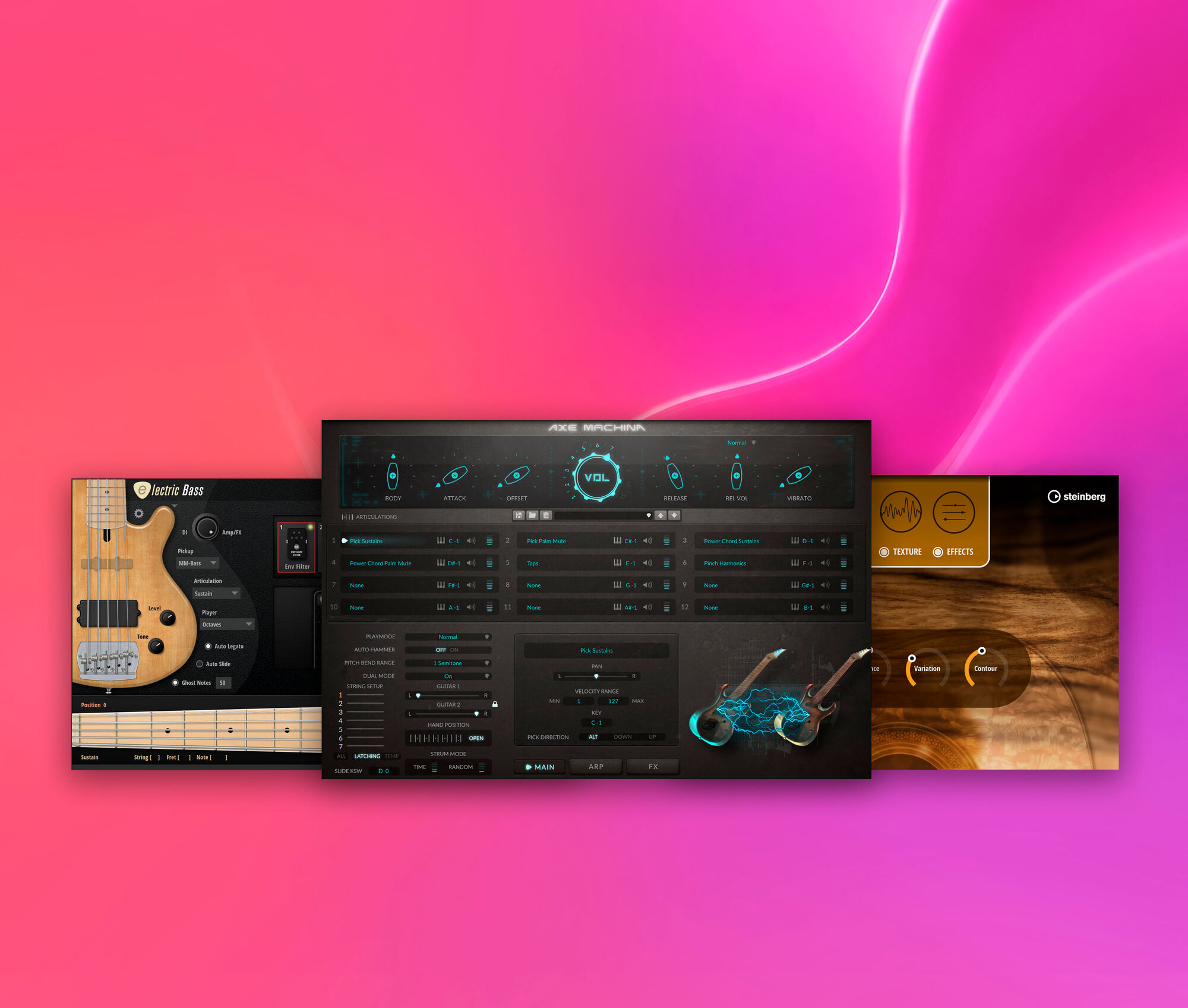 リアルでグルーヴィーなバーチャルベース「Electric Bass」、クラシックギターの開放弦サンプルとシネマチックテクスチャーをレイヤーできる「Tales」、パワフルな7弦ギターを詳細にとらえた「Axe Machina」を揃えています。