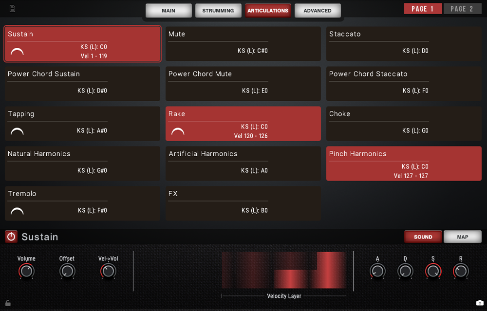 本製品は他の『Shreddage 3』シリーズと同様に、ギターの主要なアーティキュレーションを網羅しています。サステイン、レガート、スタッカート、パームミュートなど、普段エレキギター音源で曲を書くのと同じ手法で、このユニークな楽器を自在に操ることが可能です。