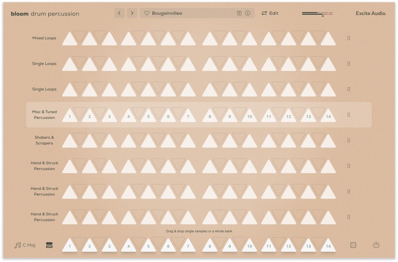 オーディオファイルをドラッグ&ドロップして、Bloomを自分専用のインストゥルメントにカスタマイズできます。エディットページの波形表示、またはバンクページの空きスロットからインポートが可能です。サンプルのキーとBPMを設定することで、Bloomエンジンとシームレスに統合させることができます。