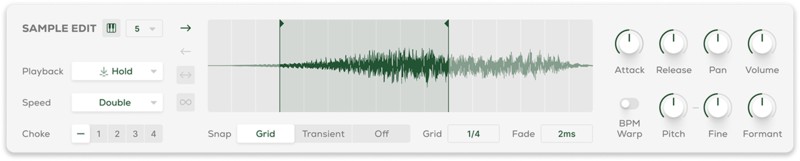 エディットページではサンプルをコントロールすることができます。サウンドを微調整して自分だけのサウンドを生み出しましょう。スタートポイントとエンドポイントを置き再生スピード、ピッチ、フォルマントで変化を加えます。
