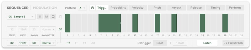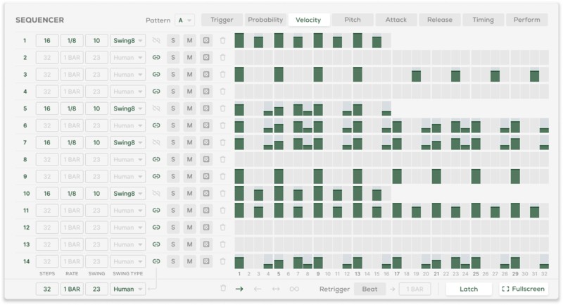 - トラックごとのトリガー、ベロシティ、プロバビリティ(確率)、アタック、リリース、タイミング、パフォーム