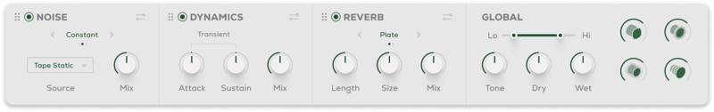 - 15種類のノイズタイプ:ビニールノイズ、カセット&テープスタティック、クラウドノイズ、ホワイトノイズ、アンプヒスなど