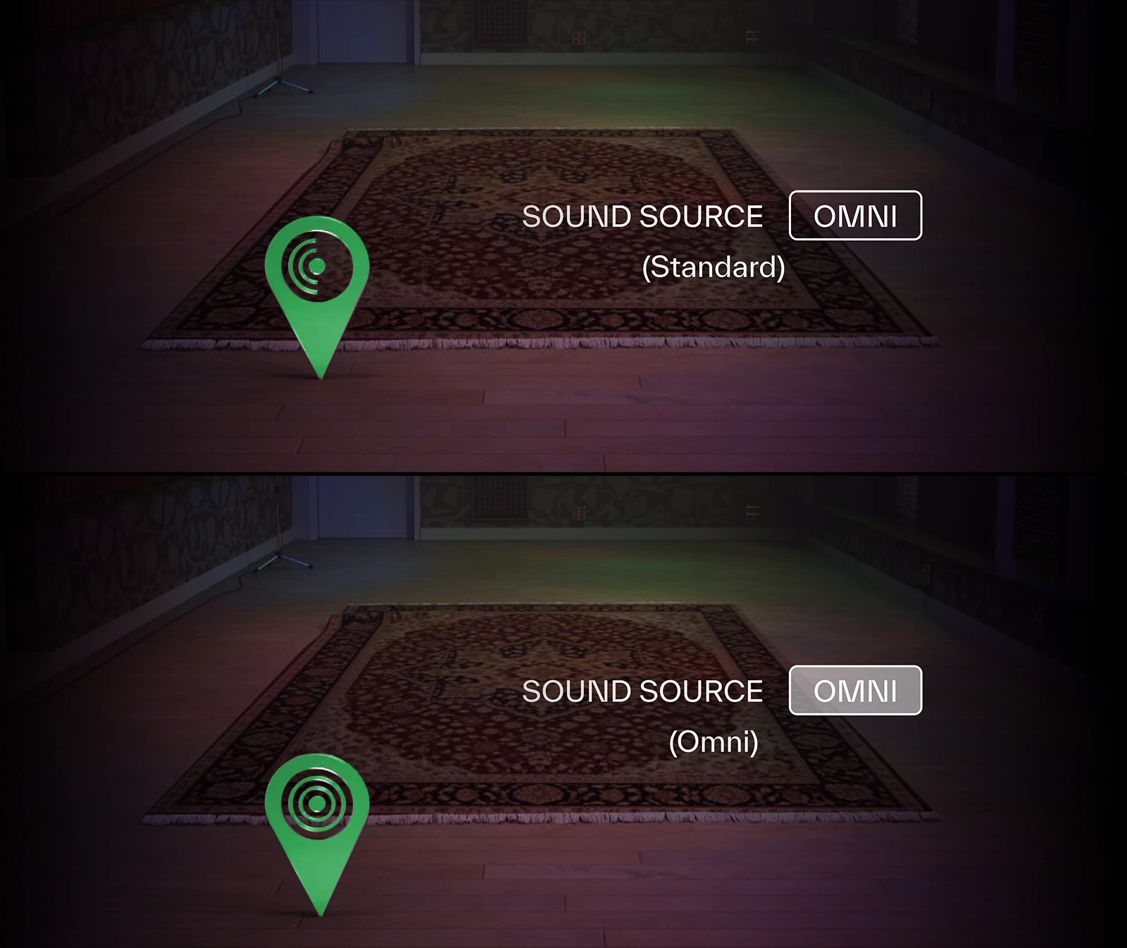 「Directionalモード」は、ボーカル、ギター・キャビネット、ブラスなどのように、特定の方向へエネルギーが集中して放射される音源向けのモードです。「Omniモード」は、ドラム、ピアノ、アンサンブルなどのように、空間全体へ均等に音が広がる音源向けのモードです。