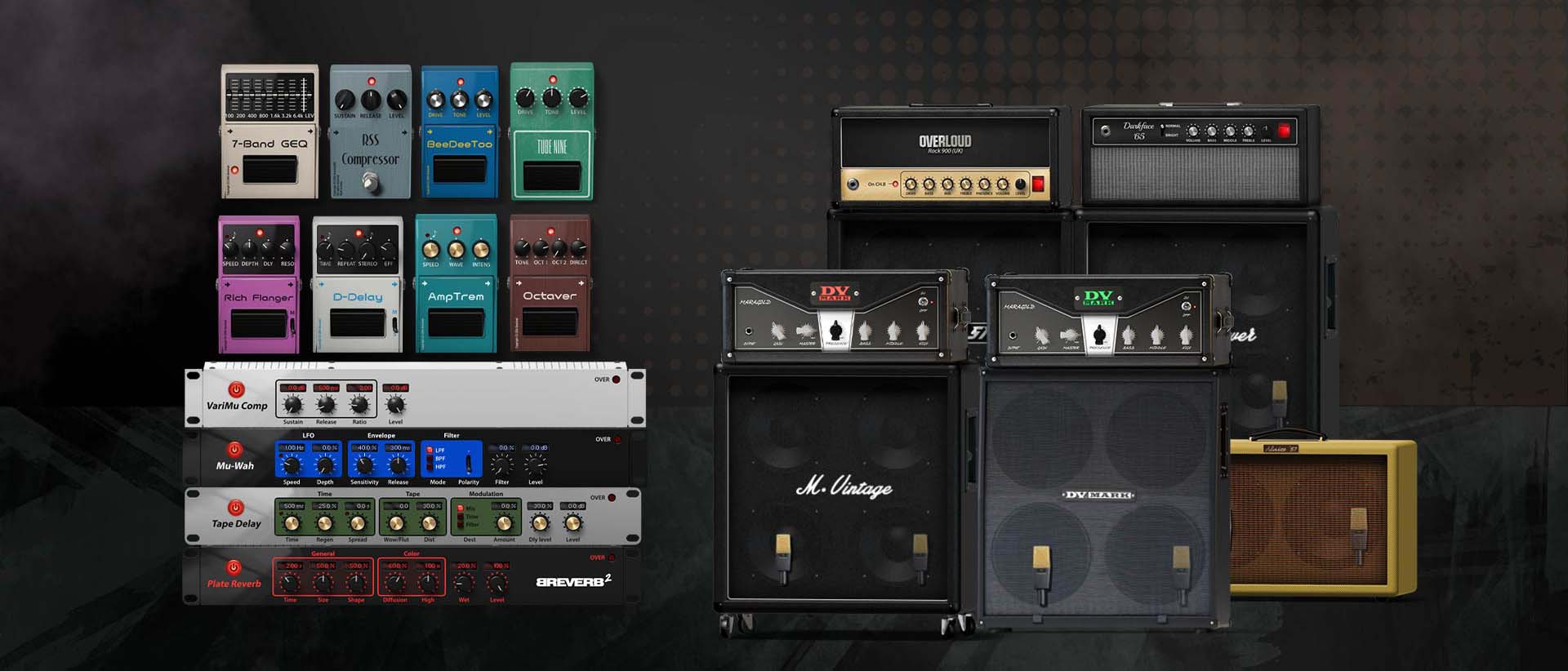 - 4つのアンプ、5つのキャブ、オーバードライブ、コンプレッサー、ディレイ、モジュレーション ペダルを含む12個のエフェクトに加えて