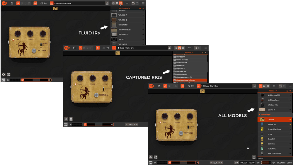 プレミアムモデルには、Centaurオーバードライブ、Tri-Chorus、Eventideスタイルのデチューンモジュレーションといった伝説的なギアのエミュレーションに加え、 Randall、THD、DV Mark、Brunettiの公式ライセンスを受けたアンプモデルも含まれています。
