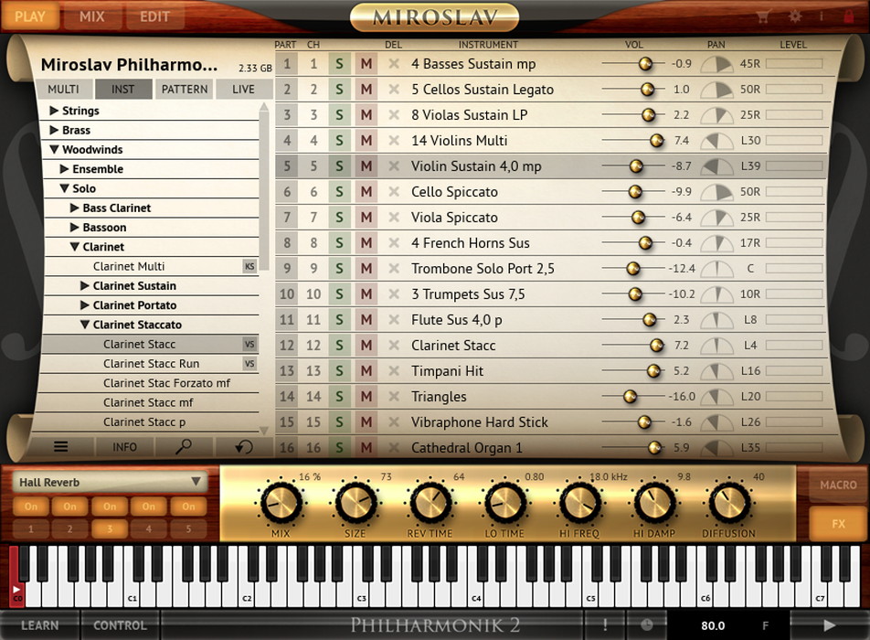 58GB以上のサンプル・ライブラリーに基づく2,700以上ものインストゥルメントが用意されており、繊細な弦楽器セクションから、色彩感豊かな木管楽器セクション、壮麗な金管楽器セクションに至るまで、意のままに楽器を組み合わせて、自分だけのオーケストラを編成することができます。