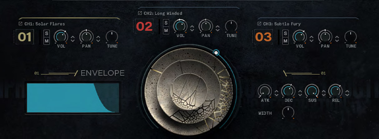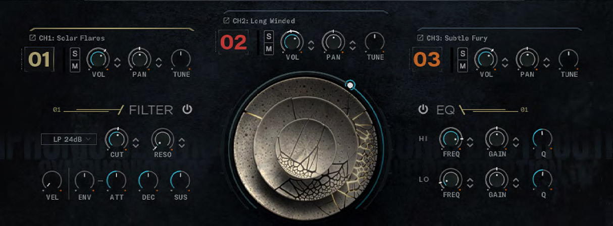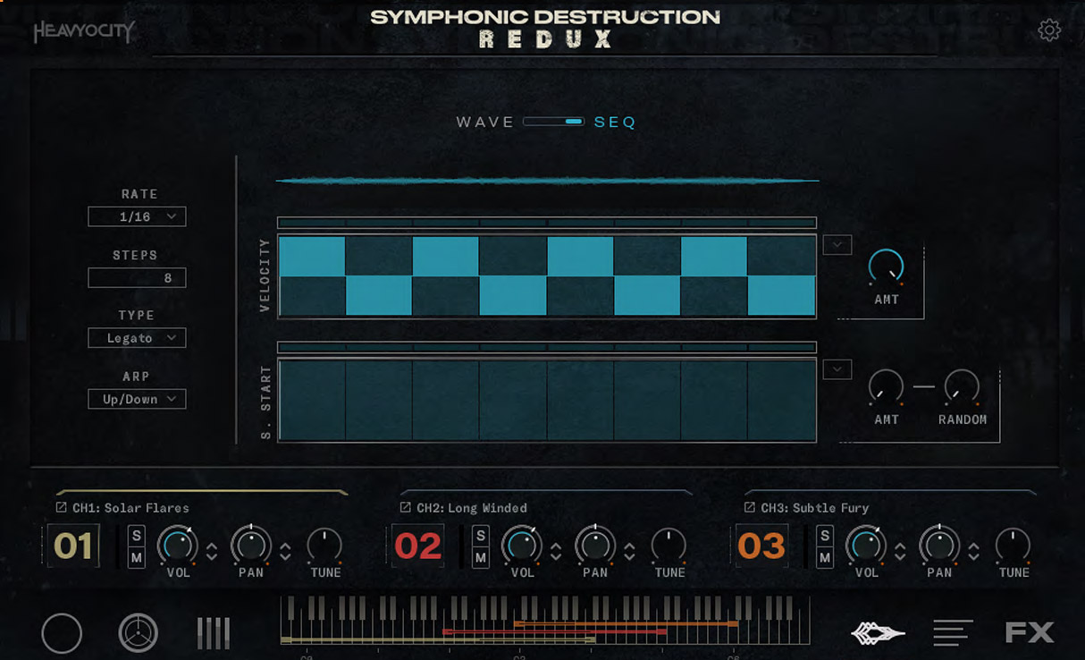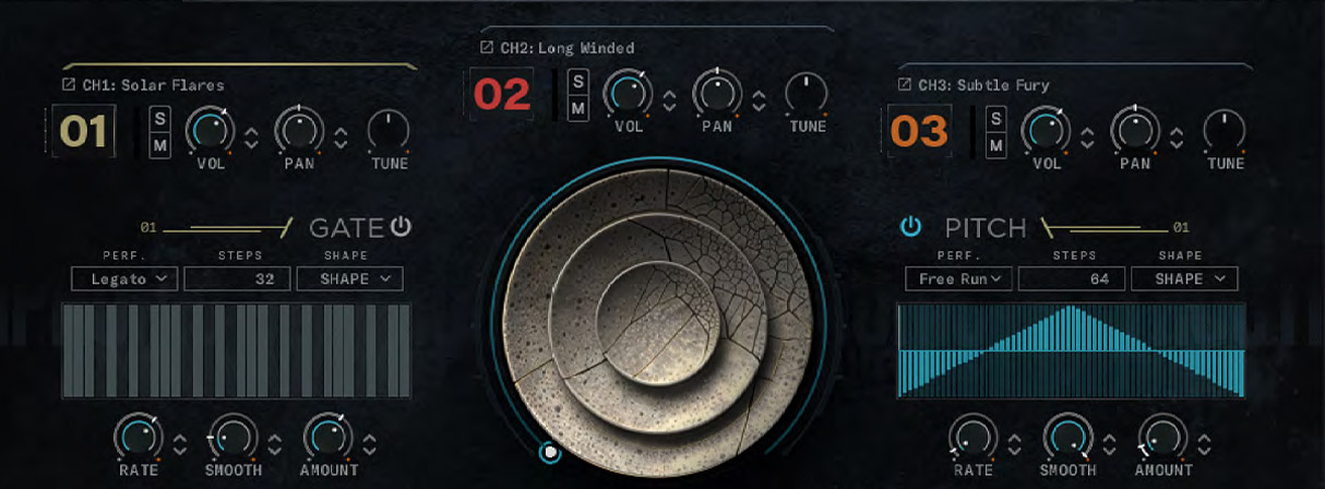 ディープなサウンドデザイン向け。個別のソースをロードした3つのチャンネルを高度にブレンドするミキサーを搭載。ボリューム / パン / チューニングなどの基本的コントロールはもちろん、ベンドレンジ、レガート、モノ / ポリ、グライドなど3つのチャンネルそれぞれ独自にカスタマイズが可能。直感的な動的パラメータ制御を可能にするMACROノブ、そして進化したシーケンサーを備えており、ダイナミックで変化し続けるサウンドを構築できます。