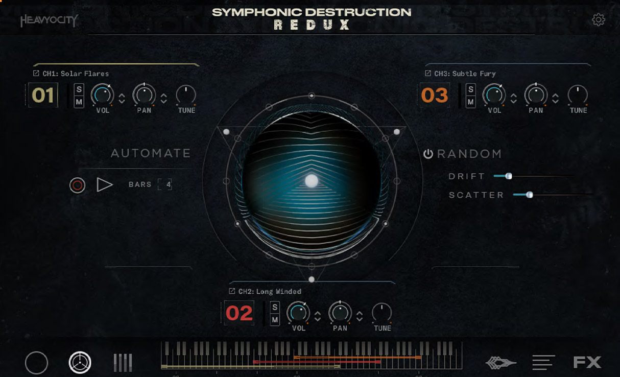 画面中央のCHANNEL MIX REGIONS にてポインタをドラッグし、3チャンネルのミックス具合を調整します。AUTOMATE機能により、ポインタをドラッグする動きを最大4小節分記録し、オートメーションさせることが可能。DRIFT / SCATTER機能で、ポインタのポジション(チャンネルのミックス具合)をランダム化させることが出来ます。