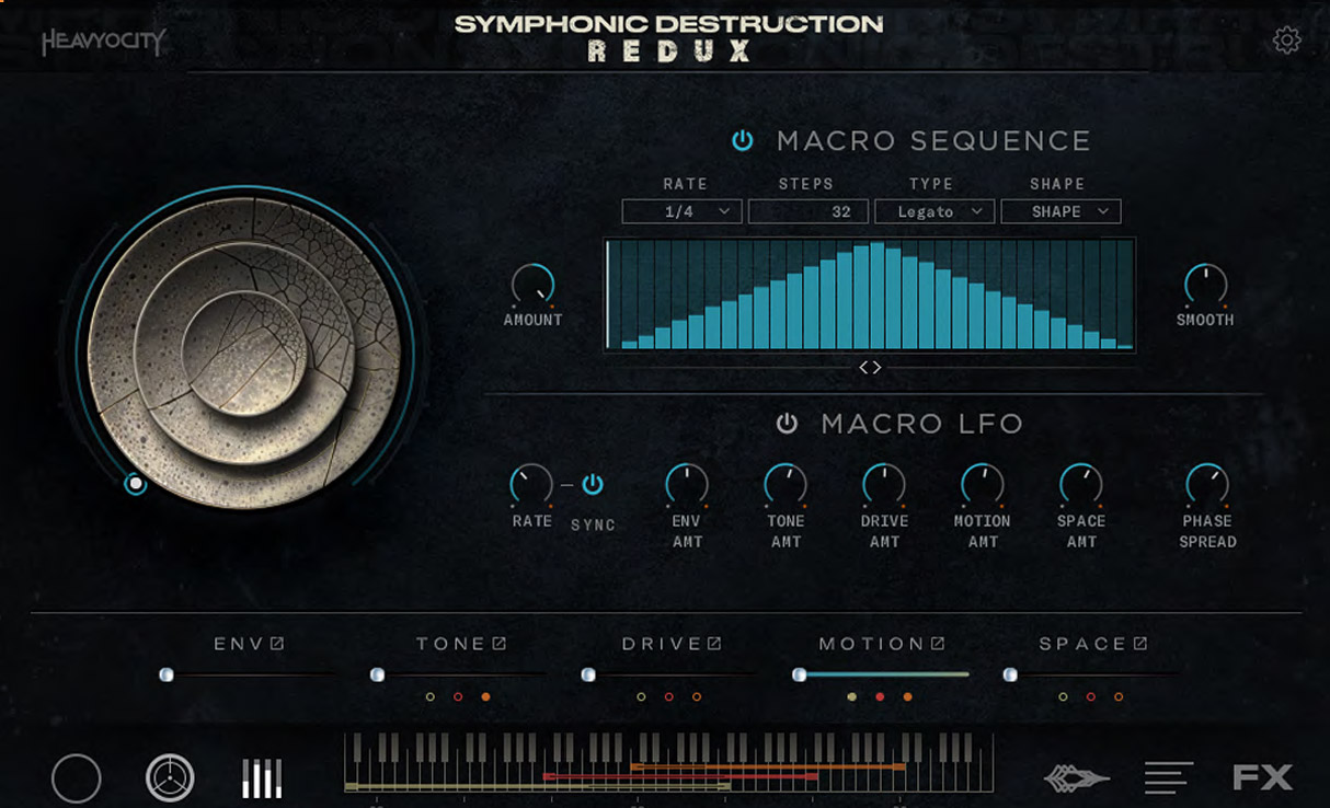 『Symphonic Destruction Redux』が搭載する「Gravity 2」エンジンは、様々なワークフローをサポートする2積のインストゥルメントを収録。ひとつは高度にスタイル化され、独立したエンベロープ / トーン / ドライブ / リバーブ・ディレイ / モジュレーションを備えた3チャンネル・レイヤーエンジン「The SD Redux Designer」。もうひとつは、多数のサンプルをキーボードに配置して、素早くサウンドへアクセスできる「The SD Redux Menu」。複数のパラメータをひとつのノブに割り当て、ダイナミックな変化を生み出す「Macro」シーケンサーや、HEAVYOCITY を代表する歪みエフェクト「PUNISH」を含むFXを駆使し、アイデアを形にすることができます。