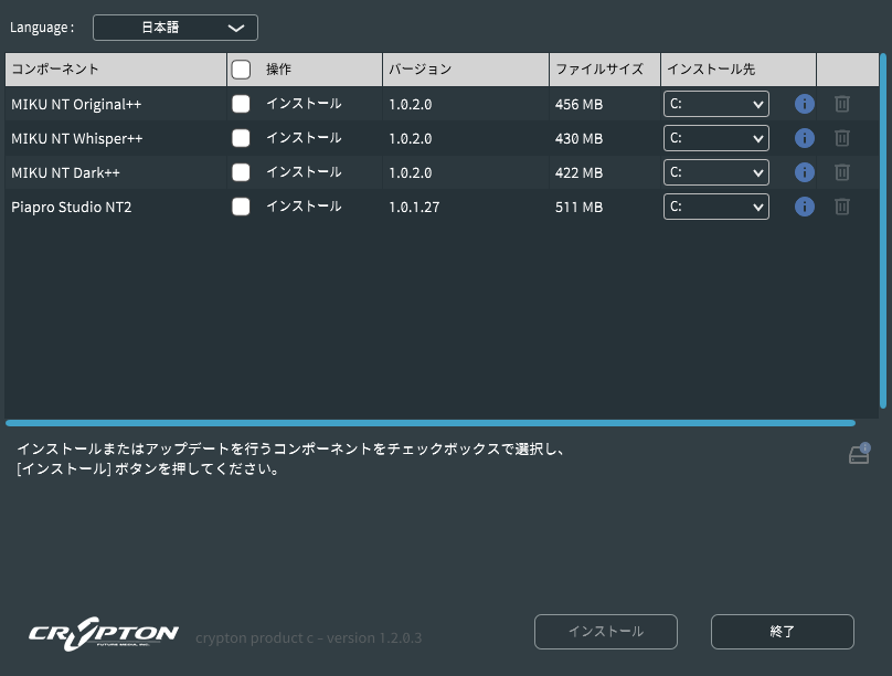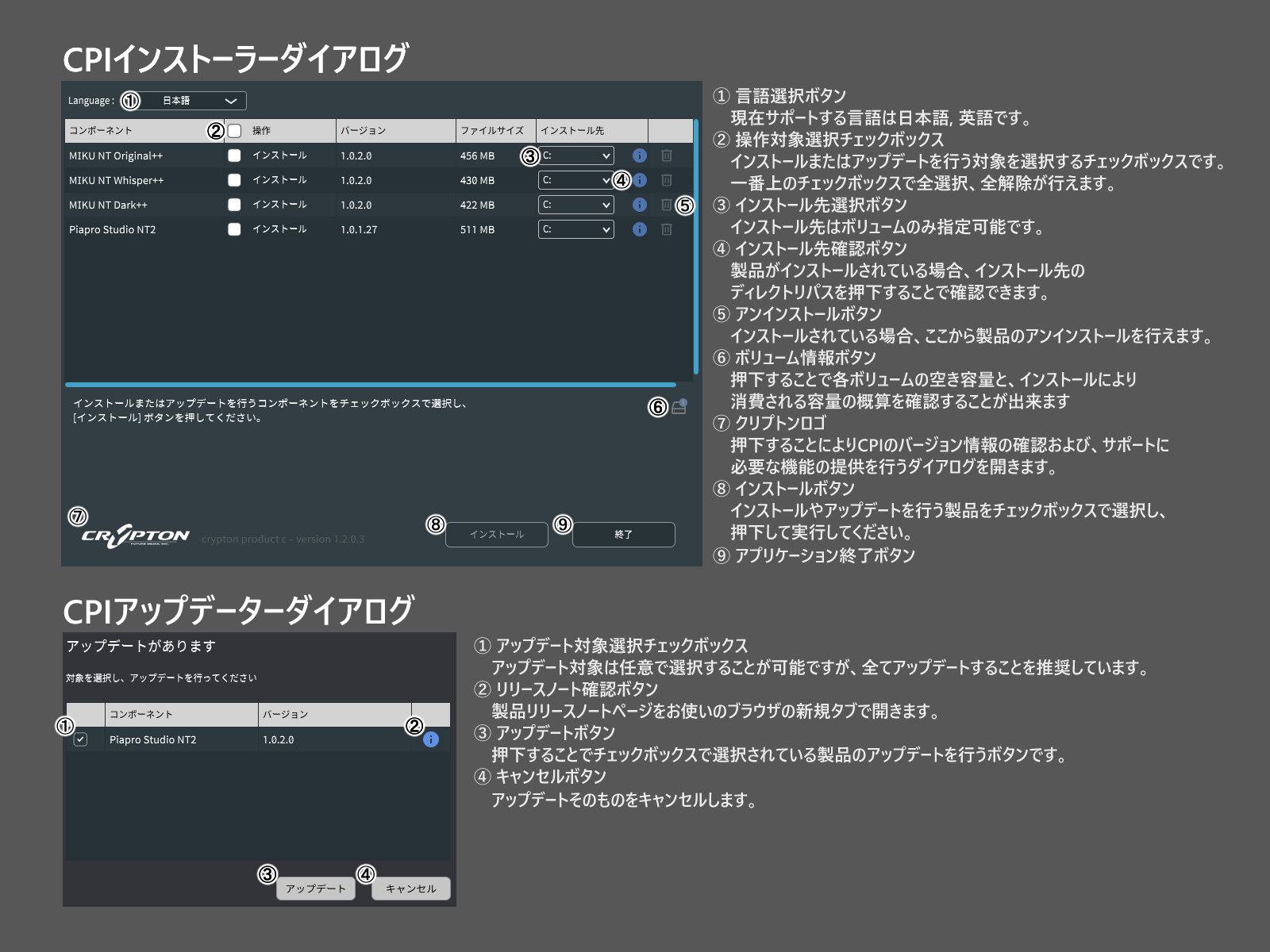 Crypton Product Installer(以下「CPI」)は、「NT」シリーズ製品用ボーカルエディター「Piapro Studio NT」をはじめとする、クリプトン製品を管理するためのアプリケーションです。