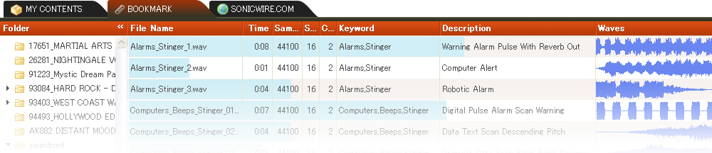 As sound information such as Tempo/Key, sampling frequency, extensions, ACID and Appleloops correspond to the display of waveform, it's easy to check the spec of the sound file while you preview the sounds. Once you find the sound you want, it's easy to add the sound file into your production environment by using the drag&drop function. You can bookmark each sound, leave notes or tag it to find it again later more easily. The downloadable version of Sound Effects Collections [Effects Packs] distributed at SONICWIRE.com are also compatible with Japanese keyword display.